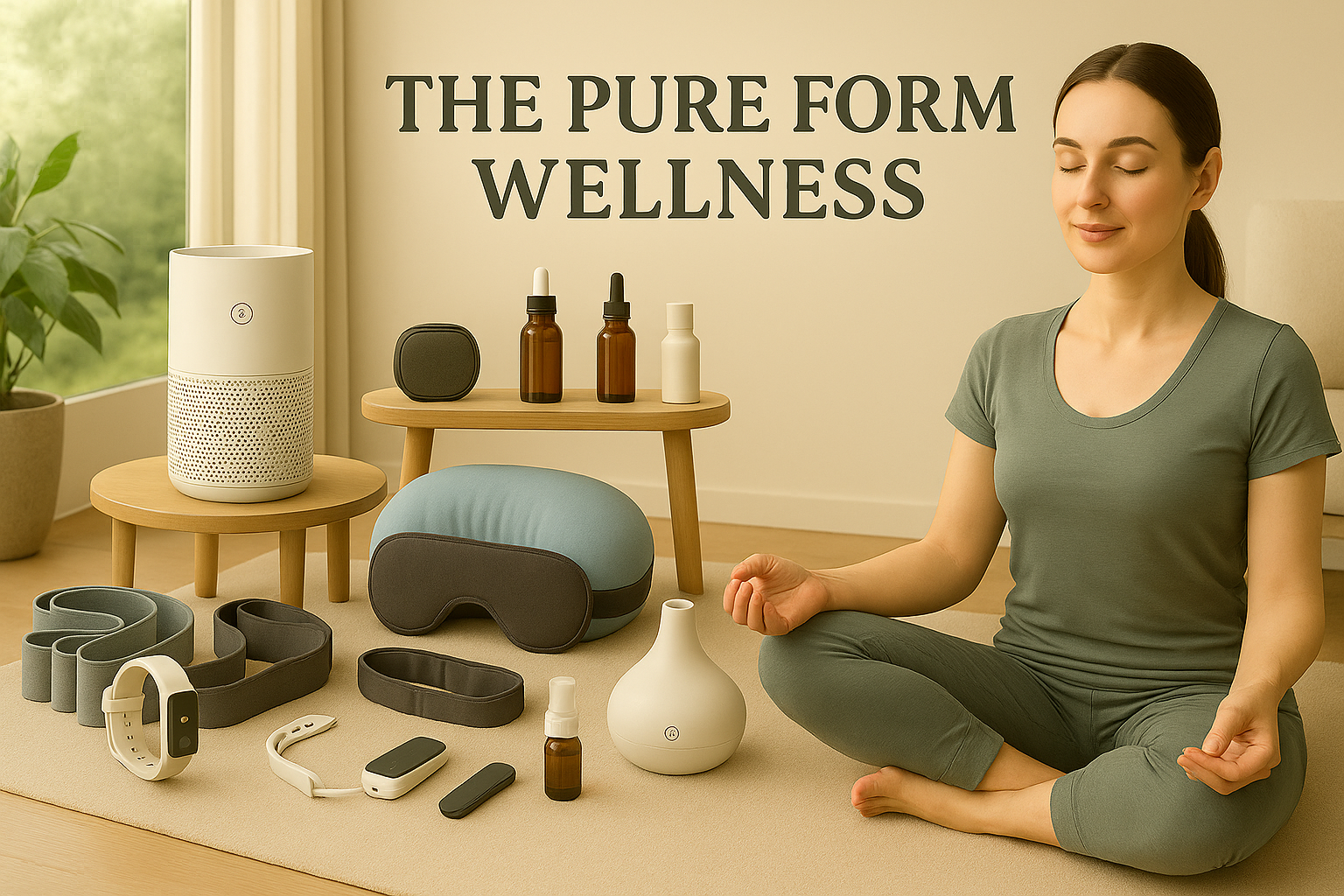 The Pure Form Wellness offers Pain Relief Tech, Posture & Support, Sleep & Mind, Air & Aroma, Skin & Beauty, Mind & Body Care, Fitness & Activity, and Healthy Hydration Products.